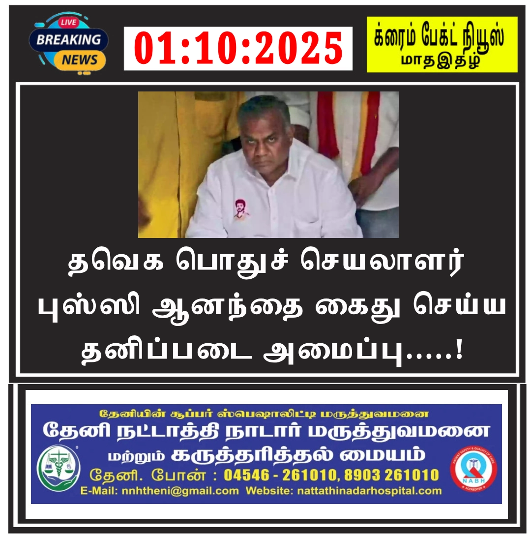சென்னை: தமிழக வெற்றிக் கழகத்தின் பொதுச் செயலாளர் புஸ்ஸி ஆனந்த் மற்றும் அக்கட்சியின் மாநில இணைச் செயலாளர் நிர்மல் குமாரை கைது செய்ய தனிப்படை அமைத்துள்ளது மத்திய மண்டல காவல் துறை. இந்த உத்தரவை மத்திய மண்டல காவல் துறையின் தலைவர் ஜோஷி நிர்மல் குமார் பிறப்பித்துள்ளார்.கரூர் வேலுசாமிபுரத்தில் செப். 27-ம் தேதி நடைபெற்ற தவெக பிரச்சாரக் கூட்டத்தில் நெரிசலில் சிக்கி 41 பேர் உயிரிழந்தனர். இது தொடர்பாக கரூர் மேற்கு மாவட்டச் செயலாளர் வி.பி.மதியழகன், பொதுச் செயலாளர் புஸ்ஸி ஆனந்த், மாநில இணைச் செயலாளர் நிர்மல்குமார் ஆகியோர் மீது கரூர் நகர போலீஸார் 5 பிரிவுகளின் கீழ் வழக்கு பதிவு செய்து விசாரணை நடத்தி வந்தனர்.