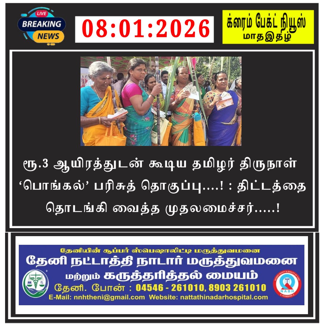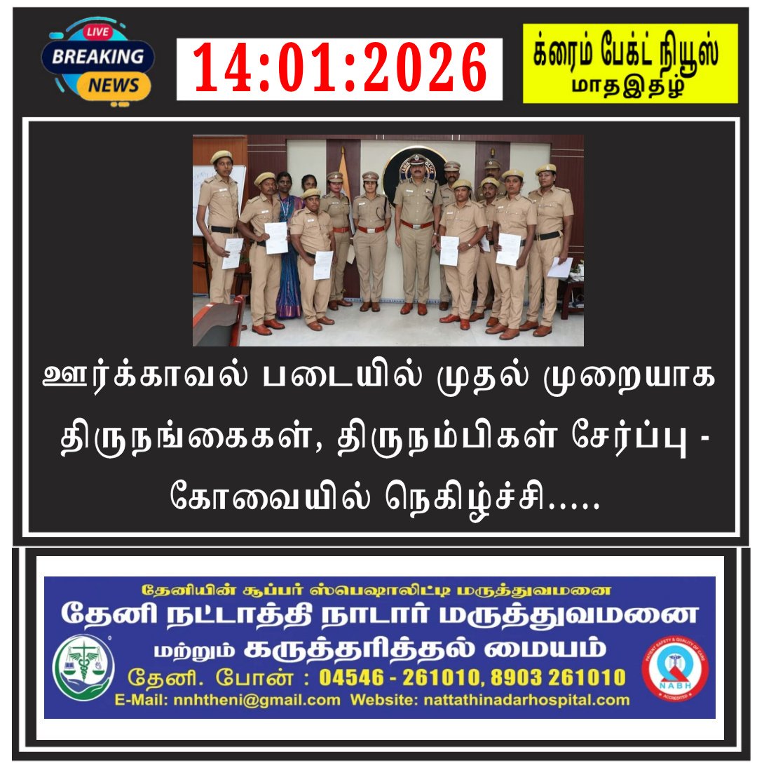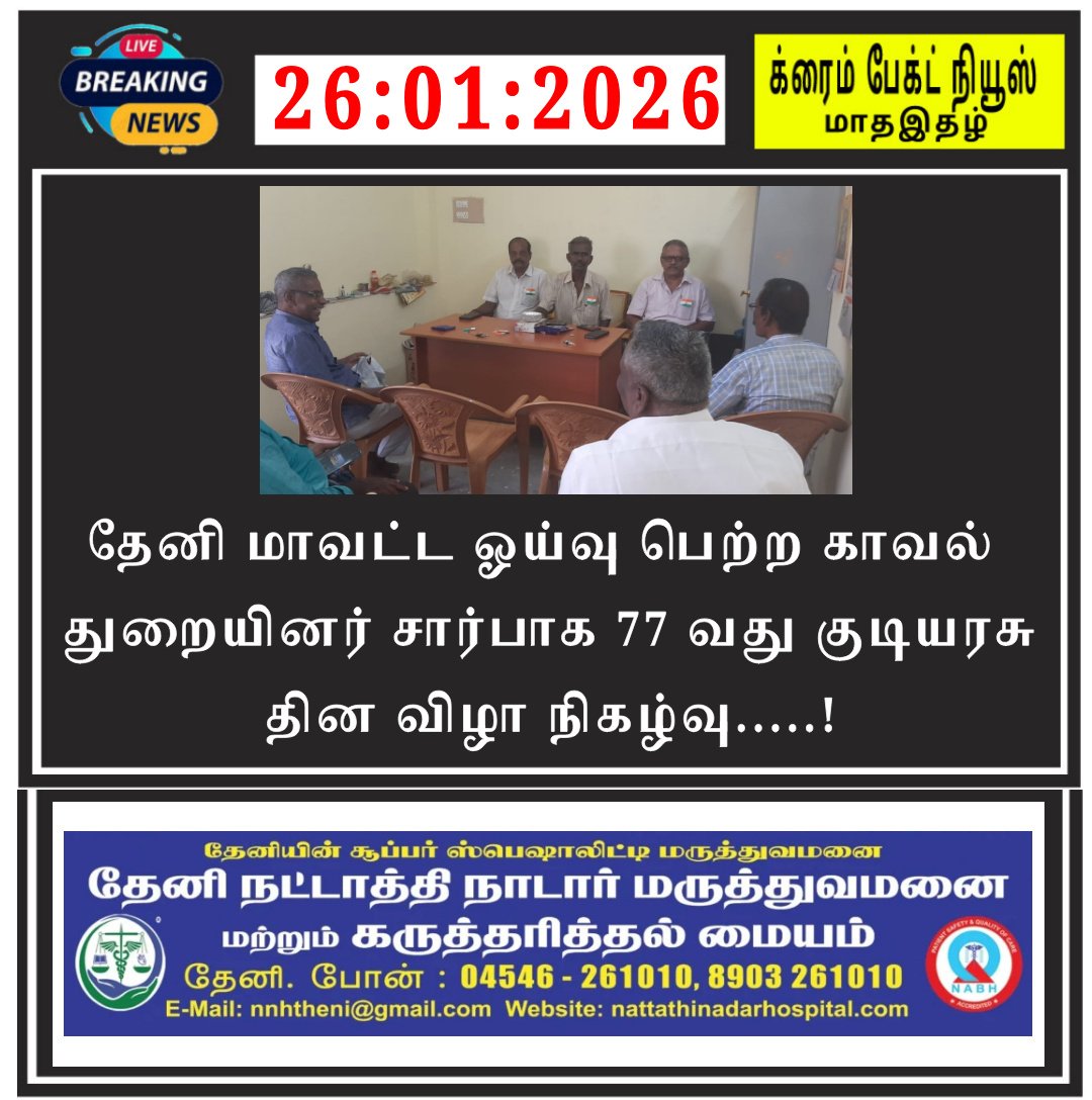 தேனி மாவட்ட ஓய்வு பெற்ற காவல் துறையினர் சார்பாக 77 வது குடியரசு தின விழாவை முன்னிட்டு தேனியில் உள்ள நலச்சங்க அலுவலகத்தில் மாவட்டத் தலைவர் திரு.P. நல்லமுத்து, மாவட்ட செயலாளர் திரு.S. கோவிந்தராஜ், மாவட்ட பொருளாளர் திரு.S ரத்தின சபாபதி,…