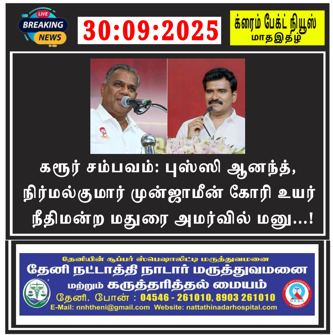 கரூர் சம்பவம்: புஸ்ஸி ஆனந்த், நிர்மல்குமார் முன்ஜாமீன் கோரி உயர் நீதிமன்ற மதுரை அமர்வில் மனு…!