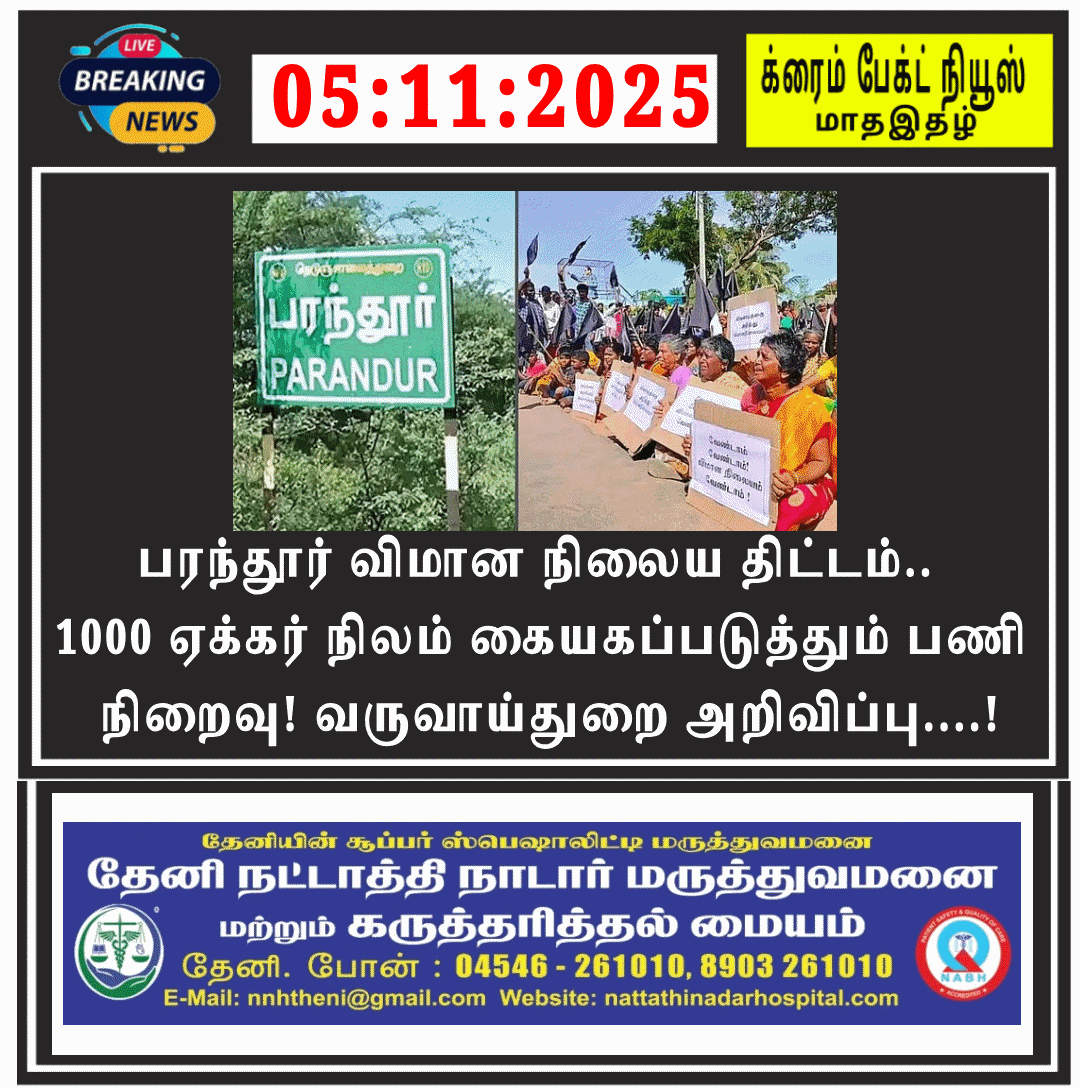 பரந்தூர் விமான நிலைய திட்டம்.. 1000 ஏக்கர் நிலம் கையகப்படுத்தும் பணி நிறைவு! வருவாய்துறை அறிவிப்பு….!
